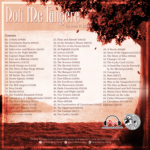 Noli Me Tangere (Audiobook) is based on public-domain translations of the novel by Dr. Jose Rizal. Featuring the new "Song of Maria Clara" sang by Katrina Saga (Melody by Timothy R. Montes, Harp Accompaniment by Ralph Yap). Leitmotif arrangements by Ralph Yap and moodLearning staff.